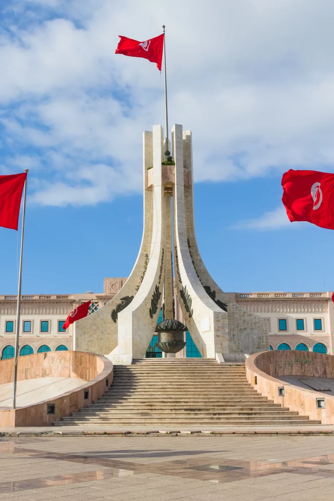 - Le fond rouge représente le sacrifice ainsi que le courage du peuple tunisien.
